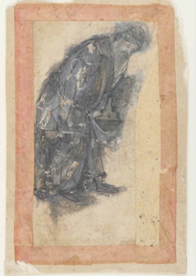 طراحی نیمه کاره و کمابیش شتابزده رضا عباسی که با نام "پیرمرد و کودک" شناخته می شود، یکی از آثار پرشمار اوست که کمترین شباهت را با آنچه نگارگری می خوانیم دارد، نه صرفا از این لحاظ که در آن از رنگ های درخشان یا ریزه کاری های تزئینی خبری نیست – چه مشخص است که این تصویری است به فرجام نرسیده و از قرار شکست خورده. این اثر پیرمردی خمیده را نشان می دهد که با کلاهی بر سر و ردایی ژنده و پرچین و شکن بر تن و گلدانی در دست دارد و در کنارش کودکی – که البته به زحمت دیده می شود – لباس پیرمرد را گرفته و همراه او گام بر می دارد. ابعاد کودک و پیرمر هم چندان متناسب نیست. کار با خطوط متعددی طراحی شده و می توان دید که هنرمند فرم ها را برها و بارها با خطوطی تازه اصلاح و حتی بخش هایی از مراحل پیشین مطالعه خطی خود را با درجاتی محدود از ماده رنگی خاکستریِ پوشان پنهان کرده است. جنس خطوط نشان می دهد که تصویر با قلم مو اجرا شده است. همه این ها با مرکب سیاه روی کاغذی پوستی طراحی شده و احتمالا بعدها کسی با بریدن و منتقل کردنش روی مقوای دست ساز زمینه طرح را نجات داده است.