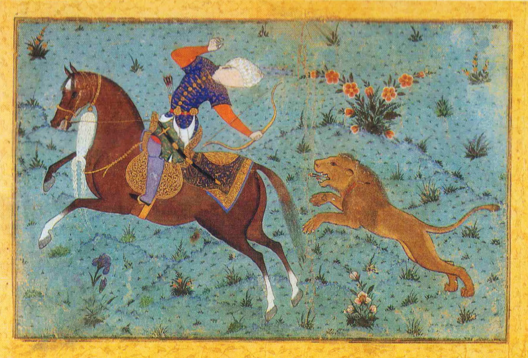 شکارچی اسب سوار/ منسوب به مظفرعلی/ تبریز/ حدود 1540 میلادی/ آبرنگ مات و طلا روی کاغذ/ 24.2 در 15.5 سانتی متر/ موزه بریتانیا/ اثر هرچند امضا ندارد، دارای ویژگی های آثار مظفرعلی، هنرمند خبره در نقاشی اسب است