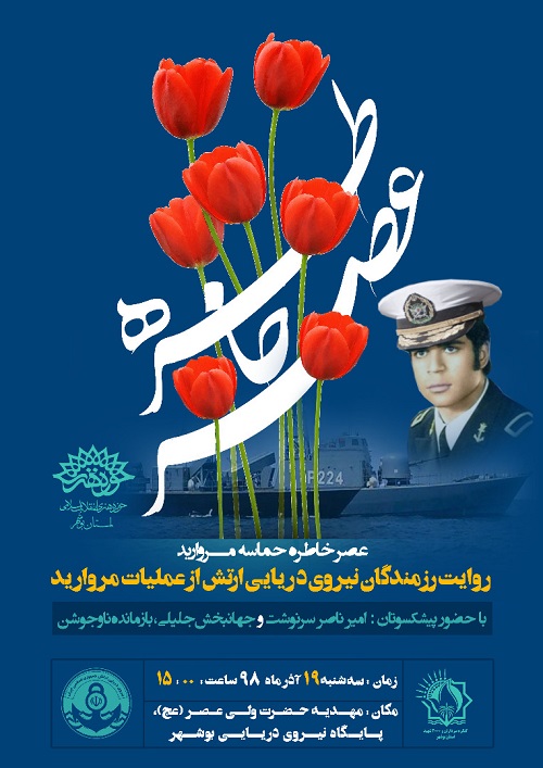 پارسایی فر با اشاره به برگزاری عصر خاطره خاطر نشان کرد: عصر خاطره دفاع مقدس با عنوان حماسه "عملیات مروارید" روز سه شنبه ۱۹ آذر ماه در سالن اجتماعات پایگاه نیروی دریایی ارتش استان بوشهر برگزار می شود.